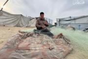 صياد يجلس على شاطئ بحر رفح، منهمكًا في إصلاح شباك صيده بأدوات بدائية