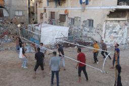شبان فلسطينيون يمارسون كرة الطائرة بجوار أنقاض منازلهم المدمرة في خان يونس جنوب قطاع غزة