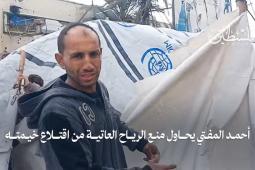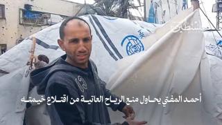 الشاب "المفتي" يحاول منع الرياح العاتية من اقتلاع خيمته