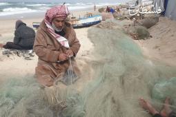 صياد فلسطيني يُصلح شباكه المهترئة بغزّة، متمسكًا بلقمة عيشه رغم استمرار منع إدخال معدات الصيد