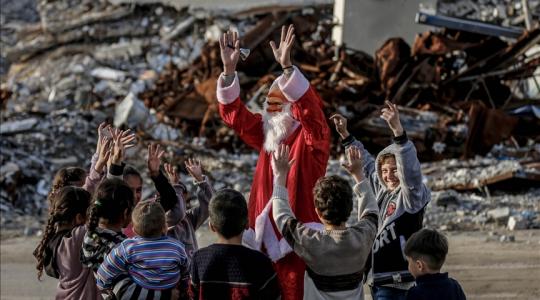 "بابا نويل" فوق الركام يعزف الأمل لأطفال غزة