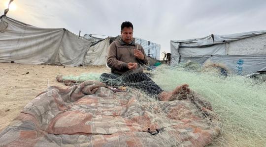 صياد يجلس على شاطئ بحر رفح، منهمكًا في إصلاح شباك صيده بأدوات بدائية