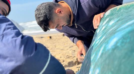 صيادان يحاولان ترميم قاربهما الذي تضرر بشظايا صاروخ إسرائيلي بأدوات بدائية