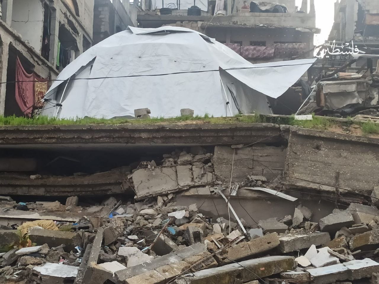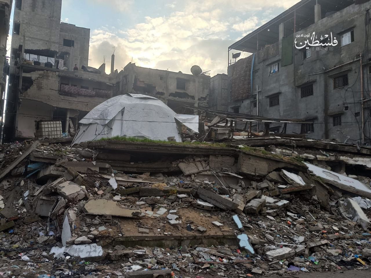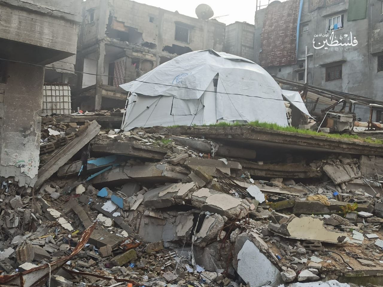 مواطنٌ ينصب أعمدة خيمته فوق منزله المدمَّر في حي الشيخ رضوان بغزة