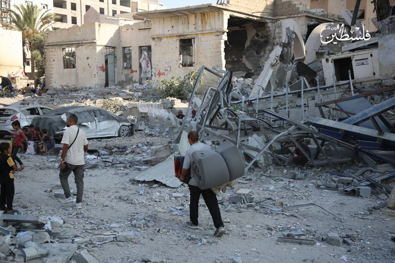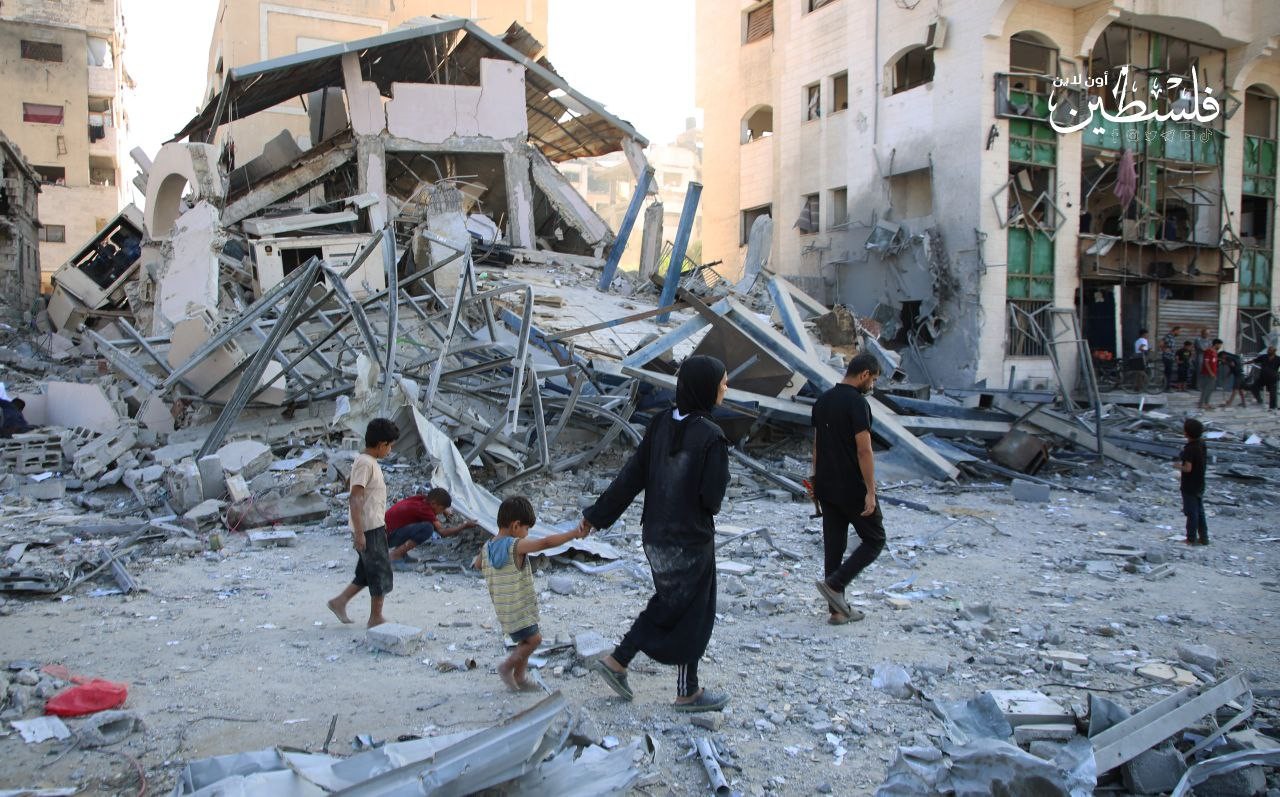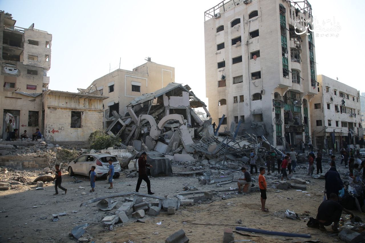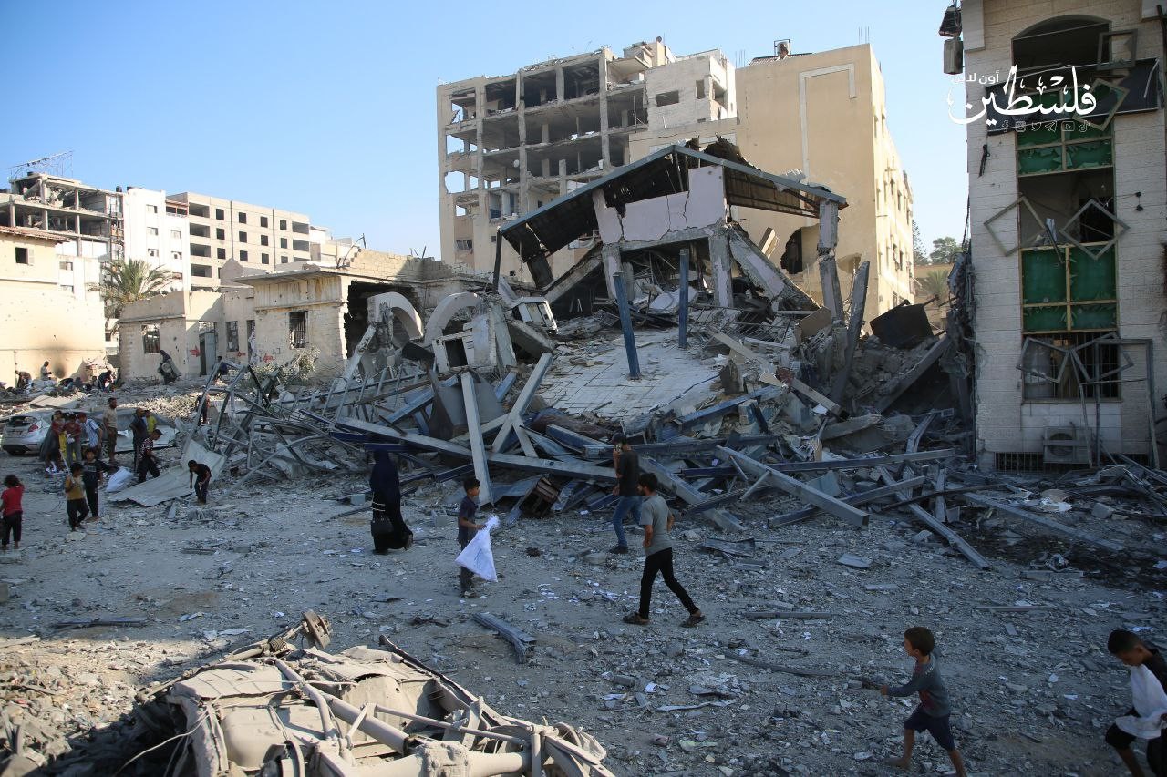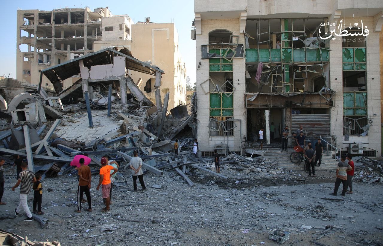 الدَّمار الذي لحق بعمارة "بنك القدس" غرب مدينة غرب غزة، عقب قصف صهيوني عنيف
