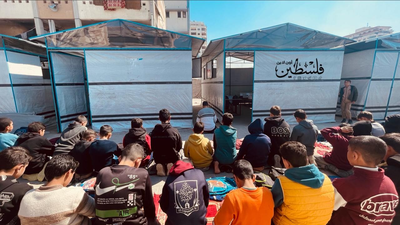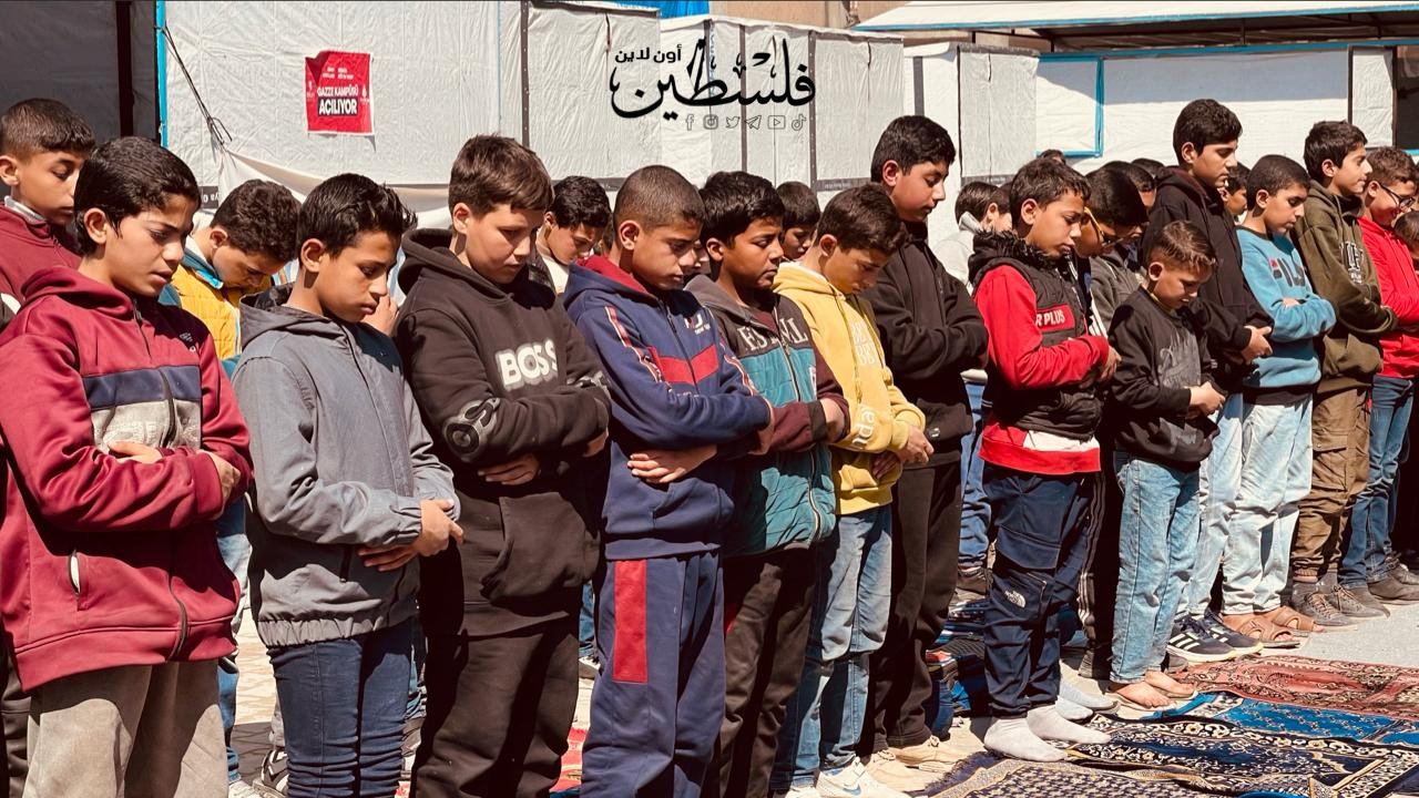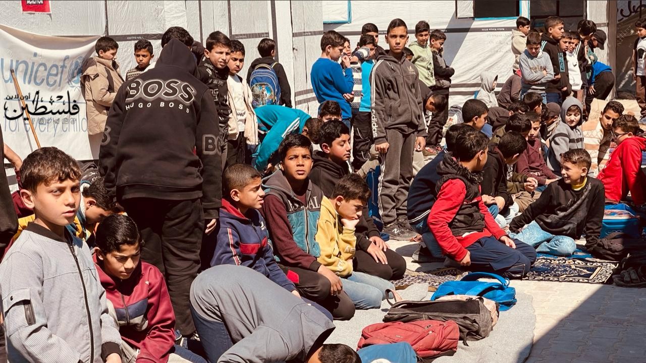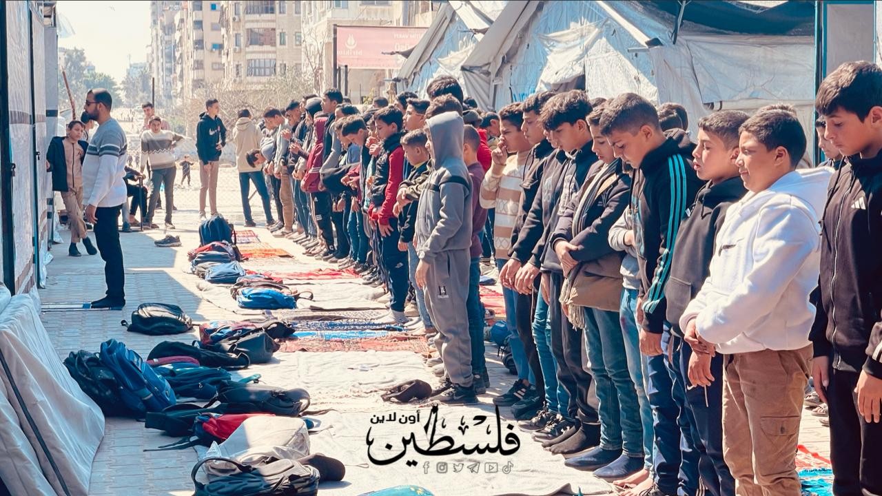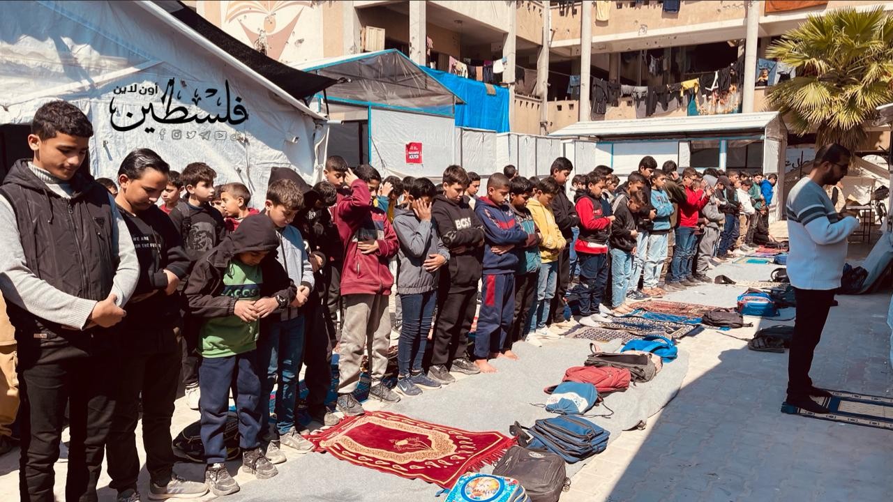 طلاب يؤدون صلاة الظهر بمدرستهم التى دمرها قوات الاحتلال خلال حرب الإبادة