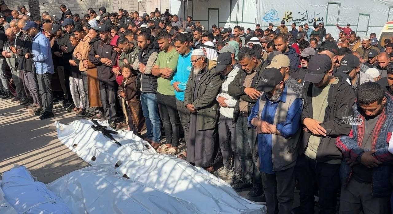 وداع 8 شهداء ارتقوا جراء قصف مسيرة إسرائيلية لسيارة شرطة بمواصي خان يونس