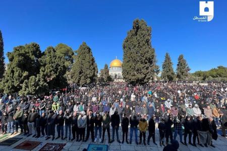 أدى عشرات الآلاف صلاة الجمعة في المسجد الأقصى المبارك، رغم الإجراءات العسكرية المشددة التي فرضتها سلطات الاحتلال الإسرائيلي على أبواب ومداخل البلدة القديمة في القدس المحتلة.