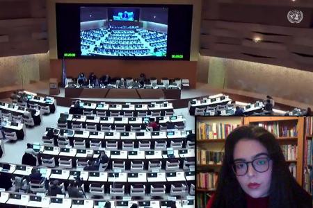 جاء ذلك في مداخلة شفهية ألقتها ممثلة المركز فرح قطينة، خلال جلسة حوار تفاعلي مع الممثل الخاص للأمين العام حول أوضاع الأطفال في مناطق النزاع المسلح، تحت البند الثالث من أعمال الدورة العادية الـ 49 لمجلس حقوق الإنسان التابع للأمم المتحدة في جنيف.
