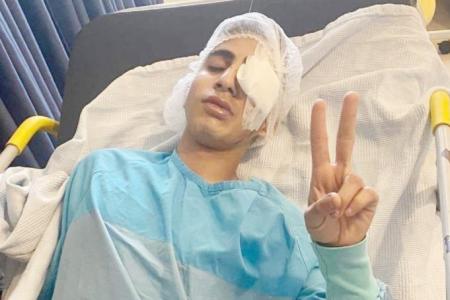 حالة من الحزن خيمت على المطور، الذي يجلس على إحدى أَسِرّة مستشفى النجاح الطبي، بعد أن أفاق من عملية جراحية لوقف النزيف من عينه اليسرى، ليجد نفسه بعين واحدة.