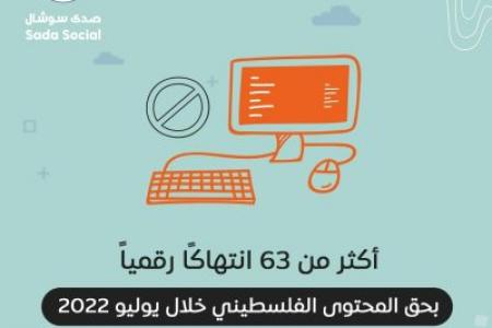 وثق مركز "صدى سوشال"، أكثر من 63 انتهاكًا رقميًا بحق المحتوى الرقمي الفلسطيني، عبر منصات التواصل الاجتماعي، خلال شهر تموز/ يوليو الماضي.
