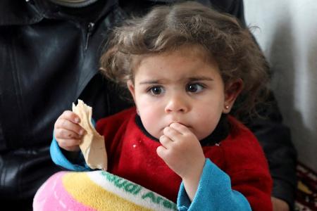 وفي وقت لاحق من اليوم، تناولت رغد، البالغة من العمر 18 شهرًا، قطعة خبز وهي تجلس على وسائد على الأرض تحت بطانية حيث ساعدت مدفأة في حمايتها من برد الشتاء.