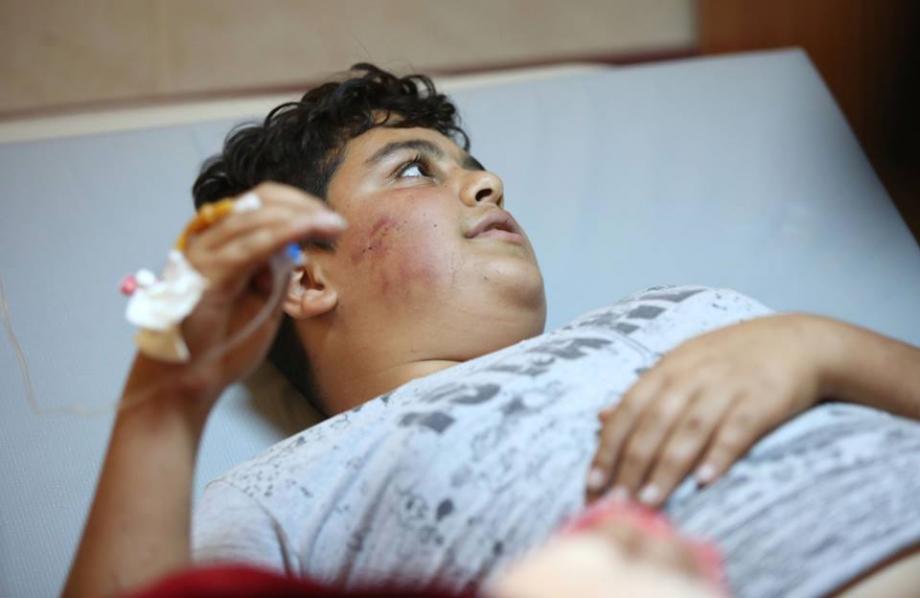 الفتى دغلس لم يستطع رفع ظهره والجلوس بالوضع السليم من شدة الالم الذي لحق به، بعد أن نجا من محاولة قتله؛ فالخدوش والرضوض تملأ جسده.