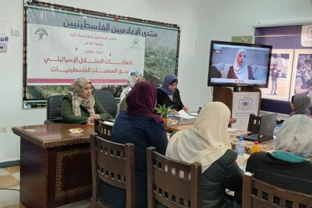 وقالت الصحفية شيرين خليفة: إن "الاحتلال الإسرائيلي يواصل انتهاكاته بحق الصحفيات الفلسطينيات على خلفية عملهن المهني، موضحةً أنه تم تسجيل ما يزيد عن 900 انتهاك بحق الصحفيين والصحفيات خلال العام الماضي"، مشيرة إلى أن أعلاها كانت في القدس المحتلة، وأن 17 صحفيًا وصحفية تعرضوا للاعتداء الجسدي، حيث تم إعدام وقتل صحفيتين العام الماضي.