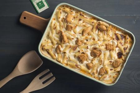 في صينية فرن، ضعي طبقة صغيرة من صوص البشاميل الجاهز.