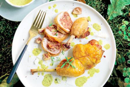 أعيدي جلد الدجاج لتغطية الحشو قدر الإمكان.