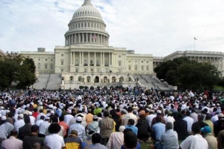 وتجمع مئات المسلمين في مسجد مركز ديانات الأمريكي في ولاية ماريلاند الأمريكية، على بعد نصف ساعة من العاصمة واشنطن العاصمة.