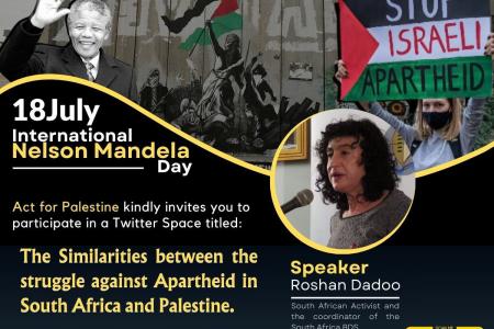 جاء ذلك خلال ندوة حوارية عقدتها مؤسسة "العمل من أجل فلسطين'' Act For Palestine عبر تويتر يوم الاثنين، بمناسبة اليوم العالمي لنيلسون مانديلا زعيم النضال ضد الفصل العنصري في جنوب أفريقيا، تحت عنوان "التشابه بين النضال ضد الفصل العنصري في جنوب أفريقيا وفلسطين".