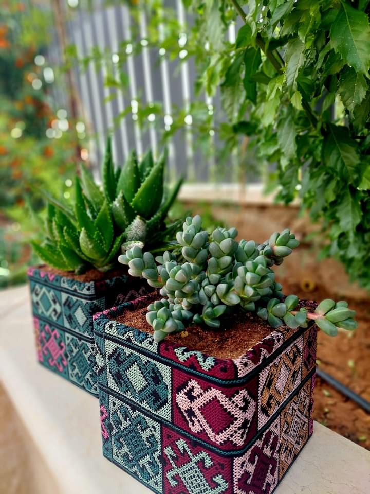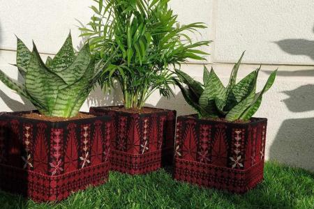 وتشير سلطان إلى أنها فكرت بإضافة اللمسة الفلسطينية على الأصص، للمحافظة على الهوية، بكسوتها بالتطريز الفلاحي، وتنسيق شتلات تتناسب مع ألوانها.