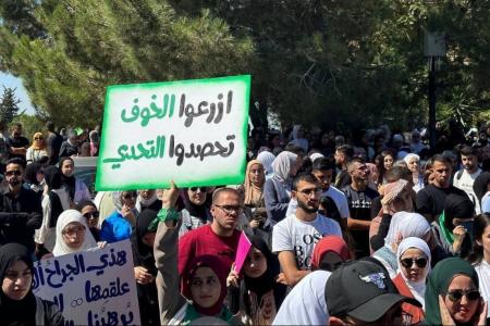 ورفعوا المشاركون في المسيرة صور الطلبة المعتقلين، ولافتات تعبر عن تحدي الاحتلال، كتب عليها "ازرعوا الخوف تحصدوا التحدي".