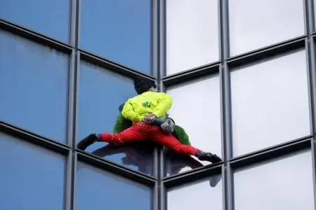 بسترة صفراء وسروال أحمر وأحذية تسلق، أنجز آلان روبير  "برج توتال" الذي يبلغ علوه 179 مترا، على مرأى من المارة في هذا الحي المالي.