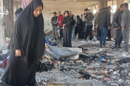 في الطَّابق الثَّالث، تتأمَّل العابد مكان الاستهداف، تبحث بين أكوام من الملابس المتناثرة عن بعض ذكريات الشُّهداء، تقف بنفس المكان الَّذي كان يعجُّ بالحركة والحياة داخل فصول تتقاسم فيها العائلات النَّازحة المساحة كما تتقاسم لقمة العيش والخبز، ولا زالت لا تستوعب ما جرى.