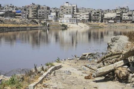 وسط روائح كريهة ومياه آسنة، يقيم نازحون فلسطينيون في خيام متواضعة بجوار بركة الشيخ رضوان، التي تحولت إلى مكب للنفايات ومياه الصرف الصحي، بعد أن دمرت الحرب الإسرائيلية البنية التحتية في قطاع غزة.
