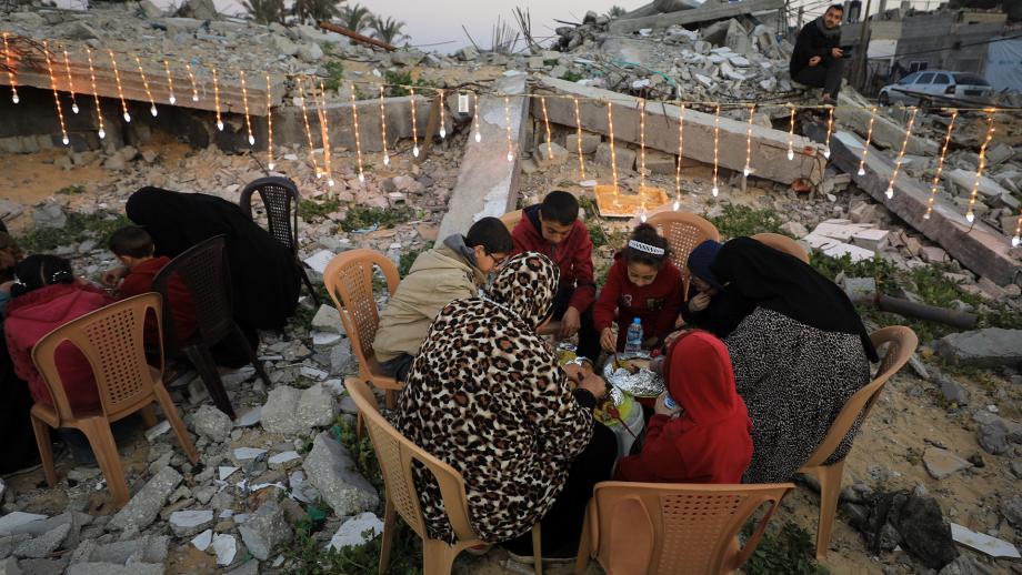على أنقاض منزلها المدمر تبحث عن الحياة وبالأخص في شهر رمضان المبارك، وتستعيد ذاكرتها كيف كانت تتجهز لاستقباله وتزيين البيت وتجتمع على مائدة الإفطار والسحور مع أبنائها، ولكن هذا العام ستقضيه في مكان لم تعهده من قبل.