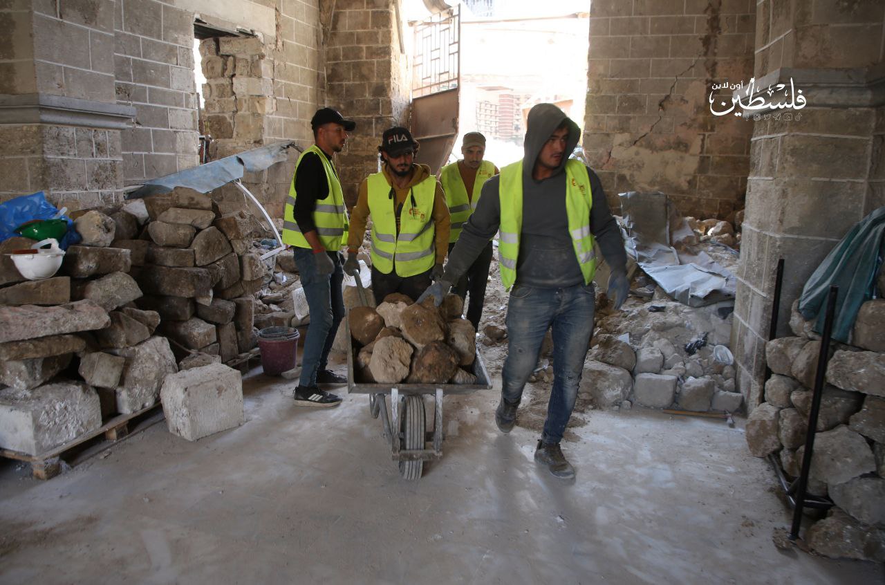 يعمل العشرات من الخبراء والفنيين داخل المسجد العمري الكبير المدمر تدميرًا شبه كلي، على جمع الحجارة، وفرزها، وتصنيفها، وتأمينها، لحين البدء بعملية إعادة الترميم الكاملة.