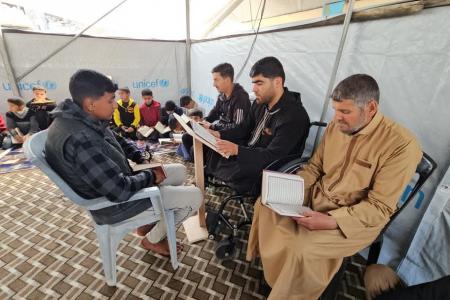 يتابع أبو محسن حديثه: "في مخيم النزوح قام المسئولون عنه بعمل مصلى خاص، فراودتني فكرة عمل خيمة خاصة بتحفيظ القرآن، والتحق بها ٣٠ طالبًا".