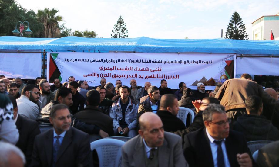 وعلق على جدران خيمة العزاء، الأعلام الفلسطينية والمصرية، ولافتات تنعى ضحايا الهجوم، وأخرى تؤكد وقوف الشعب الفلسطيني وقيادته إلى جانب أهالي الضحايا وشعب مصر.