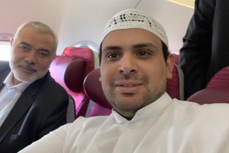 وقال المطيري :" تخيلوا هالشخص اللي تحاك عليه الروايات انه يسرق أموال الفلسطينيين ومدعوم من ايران ويملك مليارات من أموال الدعم لمقاومة الكيان الصهيوني يجلس بالدرجة السياحة مع ٣ من مرافقيه و يملك هاتف قديم ونزل المطار ينتظر شنطته".