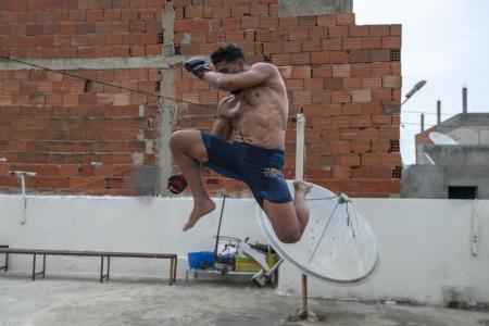 بعد الصّراع الذي انتهى بتلف الكيس البلاستيكي الذي سيتطلب إصلاحه، يبدأ عبد الرحمن نوع آخر من الركلات واللكمات في الهواء، أمام منافسٍ وهمي جديد، خفة وقوة متلازمتان، تركيزٌ شديد.