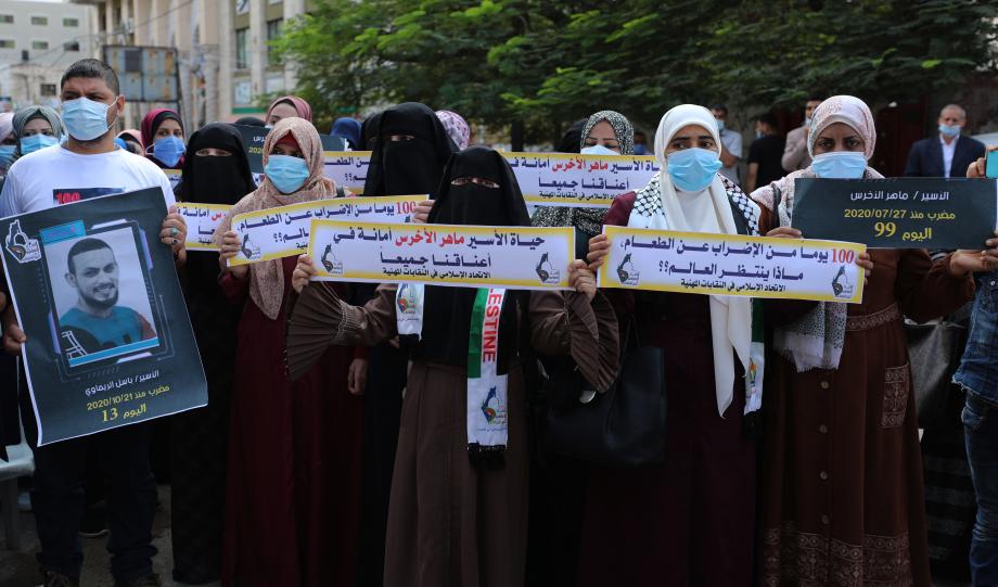 ورفع المشاركون في الوقفة، التي نظّمها "الاتحاد الإسلامي في النقابات"، الإطار النقابي لحركة الجهاد الإسلامي، لافتات تدعو للتضامن مع "الأخرس".