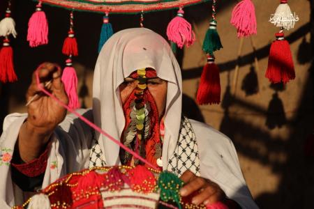 ترتدي ثوبها المطرز الذي ورثته عن والدتها، وتسدل البرقع المزين بالقطع المعدنية الذهبية والفضية على وجهها، وتخرج قرني الغزال من مخبئهما، فهما كنزها الذي وصل إليها من أجدادها القدامى، وتحمل بيديها المجعدتين ما تحتاج له من أدوات ومعدات لتخرج تجلس تحت شجرة خضراء تبعث في نفسها الحيوية والنشاط مع أشعة الشمس الدافئة.