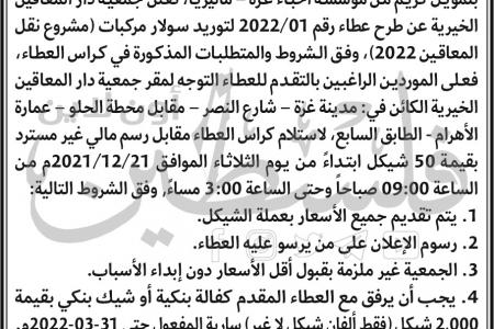 عطاء توريد سولار مركبات (مشروع نقل المعاقين) 2021-12-21T09:41:00+02:00 صحيفة فلسطين عطاء توريد سولار مركبات